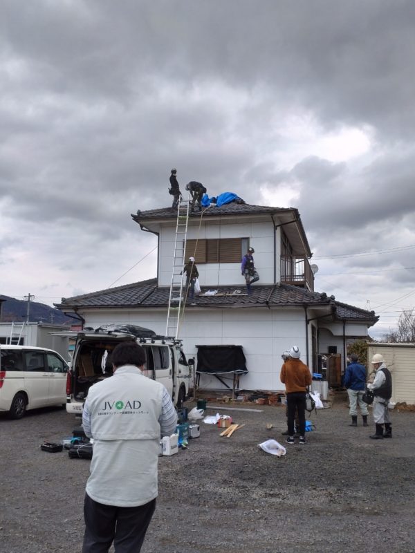 宮城県の山元町・角田市、福島県の新地町・相馬市・南相馬市・桑折町・国見町などに支援団体が入っており、一般ボランティアの方では対応できない、瓦屋根に対する応急処置(ブルーシート展張)や重機を使ったに支援活動を行っています。JVOADとしては、そのサポートや進捗状況の確認などを行っており、被災した屋根の応急処置(ブルーシート展張)の支援を行っている団体は、これまでに約159棟の対応を行ってきました。