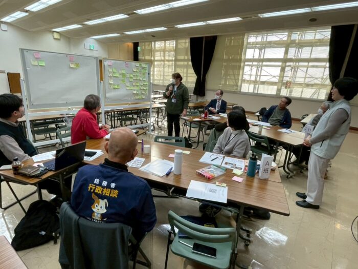 当日の研修では、講義と併せて「収集運搬体制の構築」をテーマとしたワークショップが行われ、地震発生時の収集運搬に関する課題やその解決策について、参加者同士で検討が行われました。